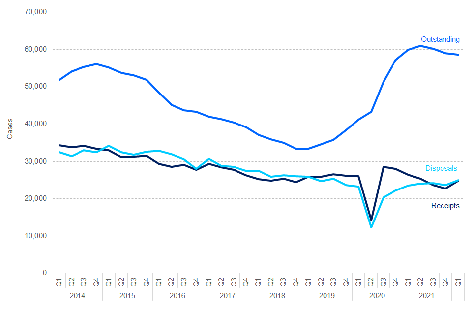 The data to April 2022 shows that receipts rose above disposals. This has caused the outstanding caseload to increase slightly, up 1% compared to March 2022 but down 3% on levels seen in April 2021.