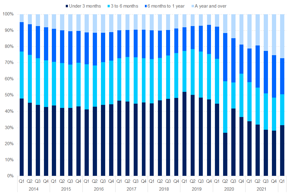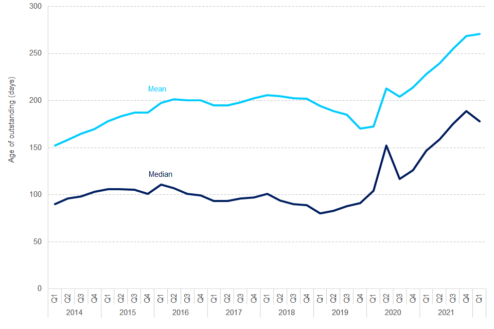 At the end of Q1 2022 there were 15,580 cases that had been outstanding for a year or more, with 4,022 of these cases outstanding for over two years. This has increased sharply following the pandemic response and represents 27% of all outstanding cases in the last period, up from 25% in the previous quarter and is the highest level seen across the series.