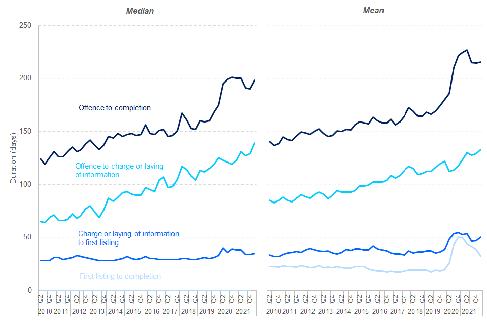 The median duration from offence to completion of defendants dealt with at the magistrates’ courts increased by 4%, up from 190 days in Q4 2021 to 198 days in Q1 2022 – back close to peak estimates seen in early 2021 (200 days).
