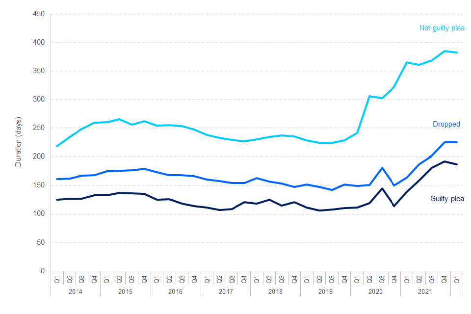 The median waiting time [footnote 8] for defendants dealt with at the Crown Court was 9.7 weeks in Q1 2022. This is similar to the previous quarter (9.6 weeks) but represents a 26% increase on the previous year (7.7 weeks).