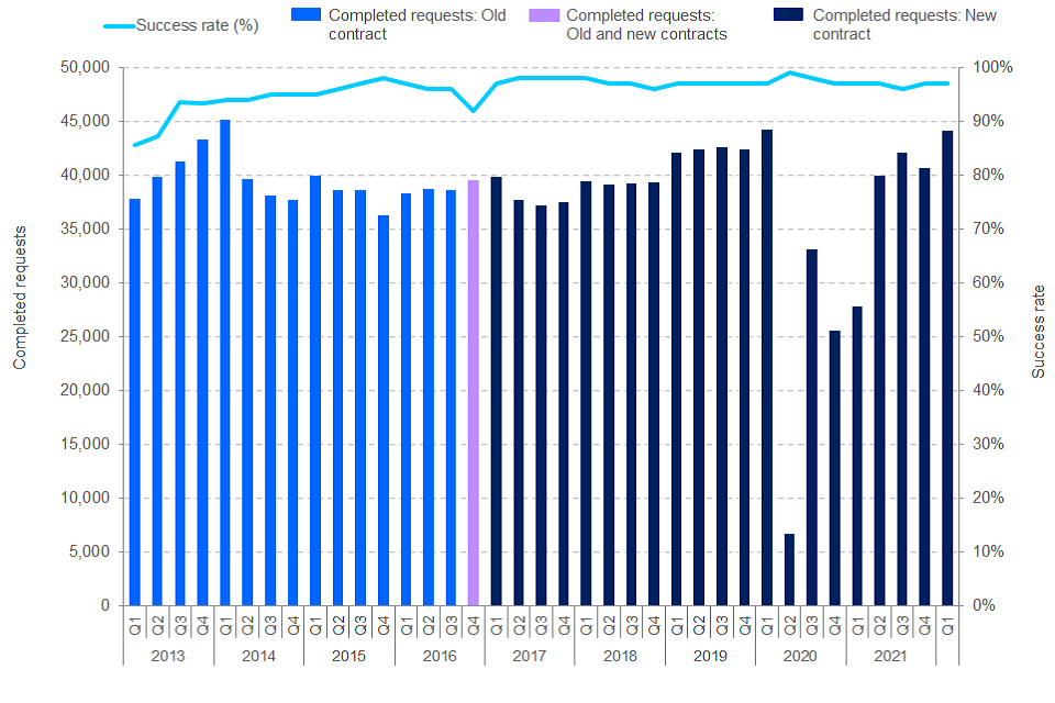 The overall success rate of requests was 97% in Q1 2022, this is similar to rates seen since 2015. The proportion of cancellations (which are excluded from the success rate calculation) increased in Q2 2020 to 34% – this has fallen back to 22% in Q1 2022 but remains above pre-COVID proportions (~14% between 2012 and 2019).