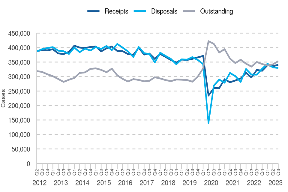 | Magistrates’ court: outstanding caseload increased | Case receipts increased by 2%, while disposals fell on the previous quarter. Disposal volumes were lower than receipts, resulting in outstanding cases increasing by 3% on the previous quarter to 352,945 in Q3 2023. |