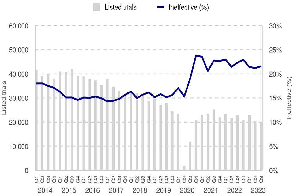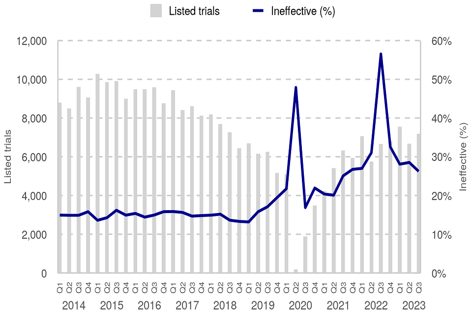Figure 2: Magistrates’ courts listed trials and ineffective trial rate (%), Q1 2014 – Q3 2023 (Source: Table M2)