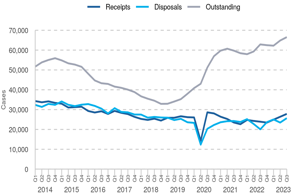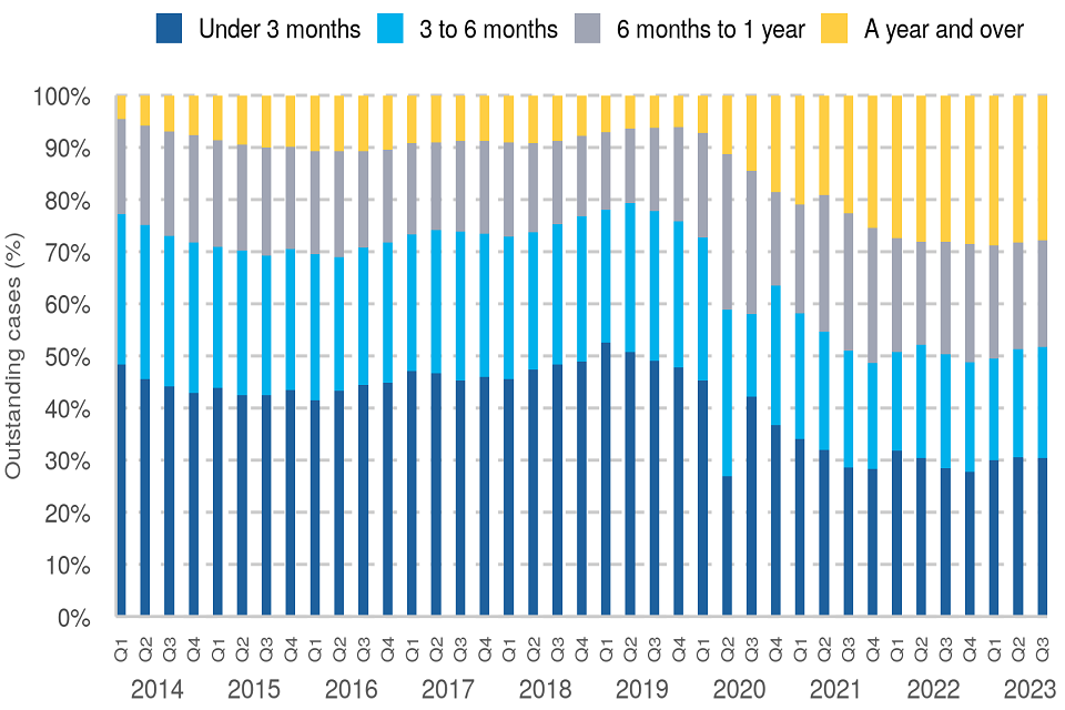 At the end of Q3 2023 there were 17,790 cases that had been outstanding for a year or more. This has tended to increase since Q4 2019 and accounted for 28% of the outstanding caseload in the latest quarter.