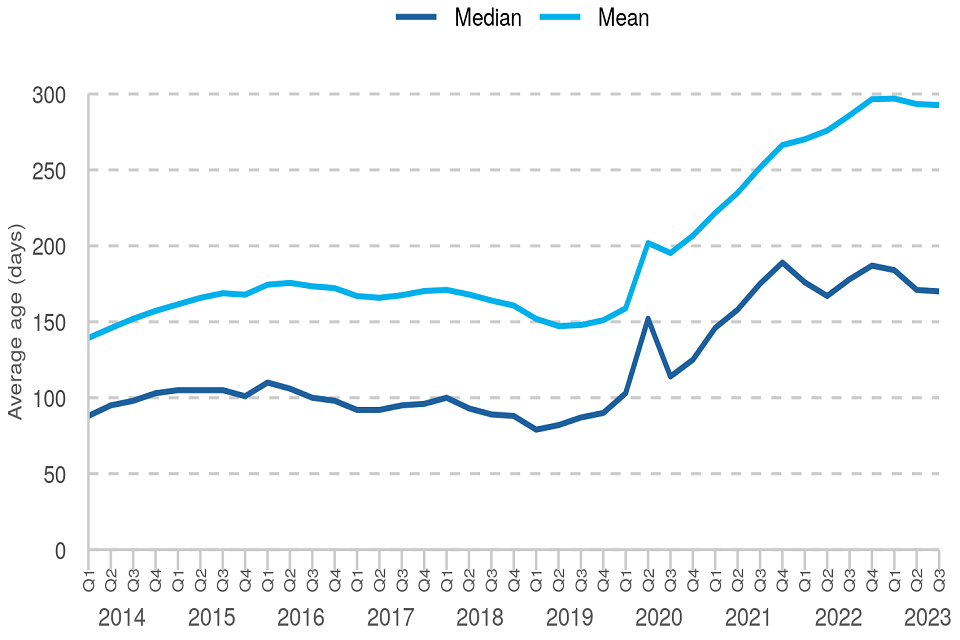 The average age of an outstanding case has increased markedly on pre-COVID levels. Both the median and mean averages have fallen in recent quarters but remain close to series peaks. In Q3 2023 the median age of all outstanding cases decreased by 1 day on the previous quarter, from 171 days to 170 days.