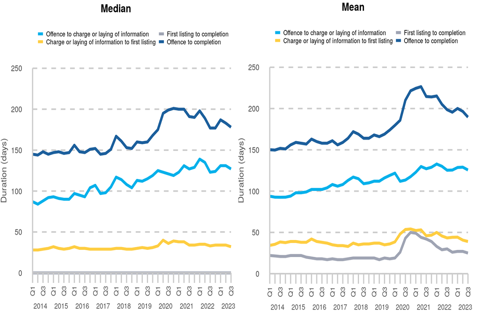 The median duration from offence to completion at the magistrates’ courts has tended to fall back from series highs of around 200 days seen in late 2020 and early 2021. The latest quarterly estimates decreased slightly on the previous quarter, from 183 days in Q2 2023 to 178 days in Q3 2023.