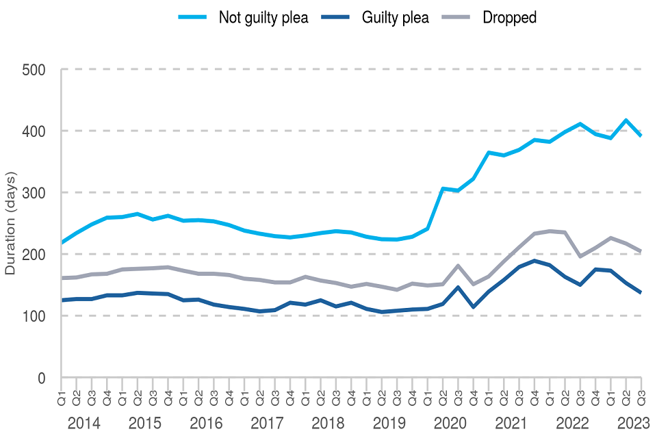 Figure 8: Median duration from receipt to completion in ‘for trial’ cases by plea at the Crown Court, Q1 2014 – Q3 2023 (Source: E2)