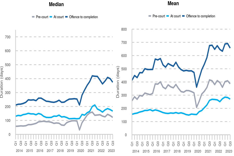 ‘Pre-court’: the median time from ‘offence to first listing’ decreased by 10% from 135 days in Q2 2023 to 122 days in Q3 2023.