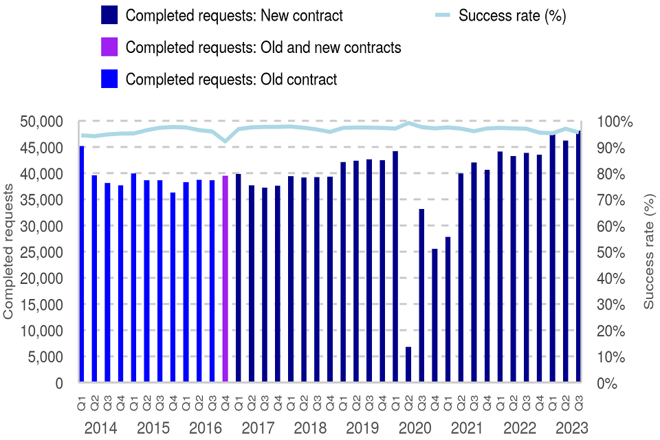 The overall success rate in Q3 2023 was 96% - this is a small (1 percentage point) fall compared to the previous quarter. This fall may reflect the extra demand seen in the increased volume of requests.