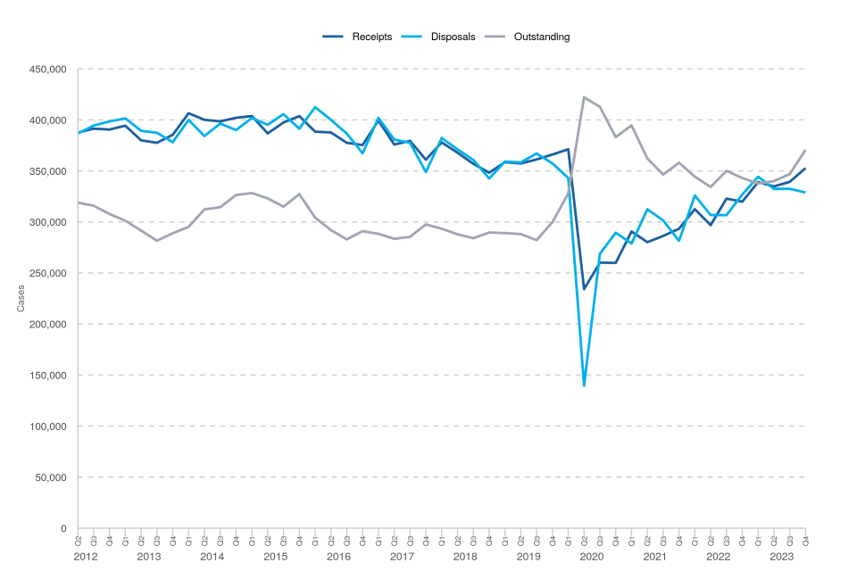| Magistrates’ court: outstanding caseload increased | Case receipts increased by 4%, while disposals fell on the previous quarter. Disposal volumes were lower than receipts, resulting in outstanding cases increasing by 7% on the previous quarter to 370,731 at the end of Q4 2023. |