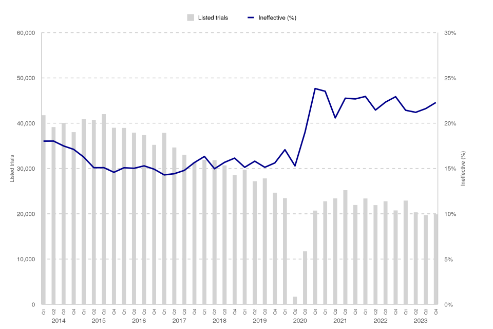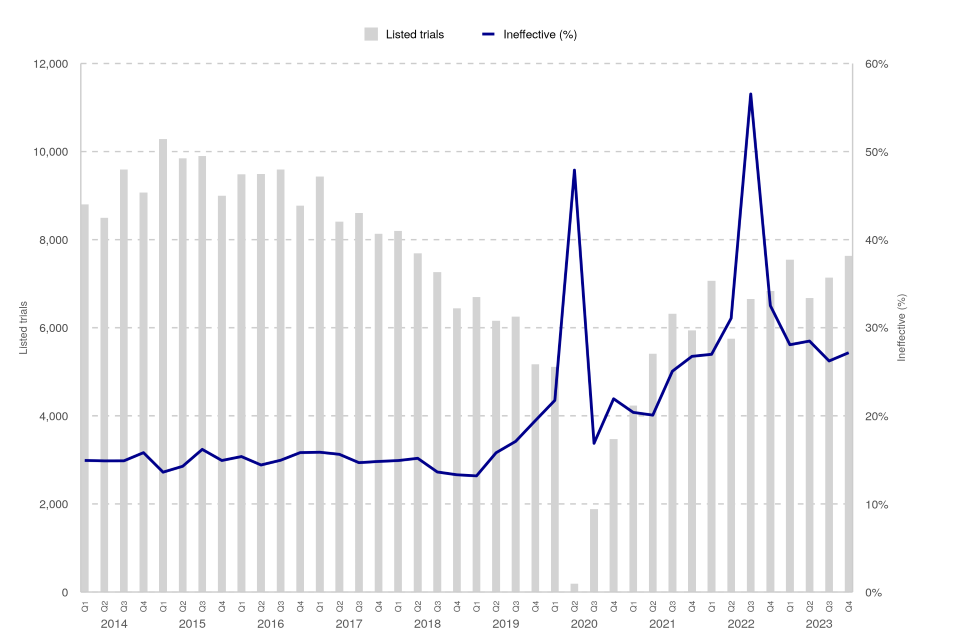 Figure 2: Magistrates’ courts listed trials and ineffective trial rate (%), Q1 2014 – Q4 2023 (Source: Table M2)