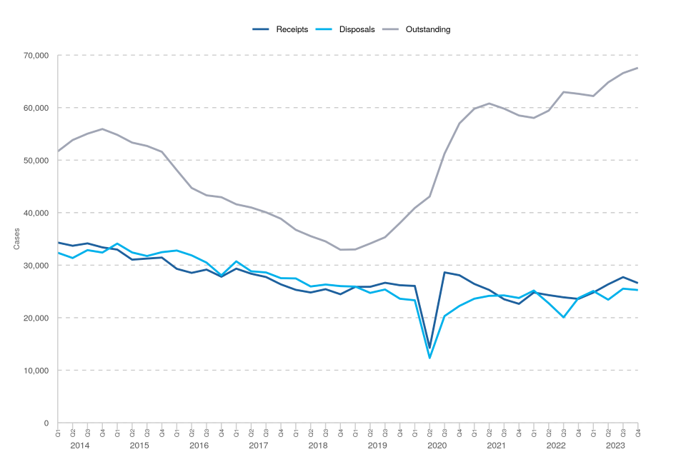 Receipts and disposals fell compared to the previous quarter – both remain above volumes seen a year ago. There were more receipts than disposals, so the outstanding caseload increased, up by 1% on the previous quarter.