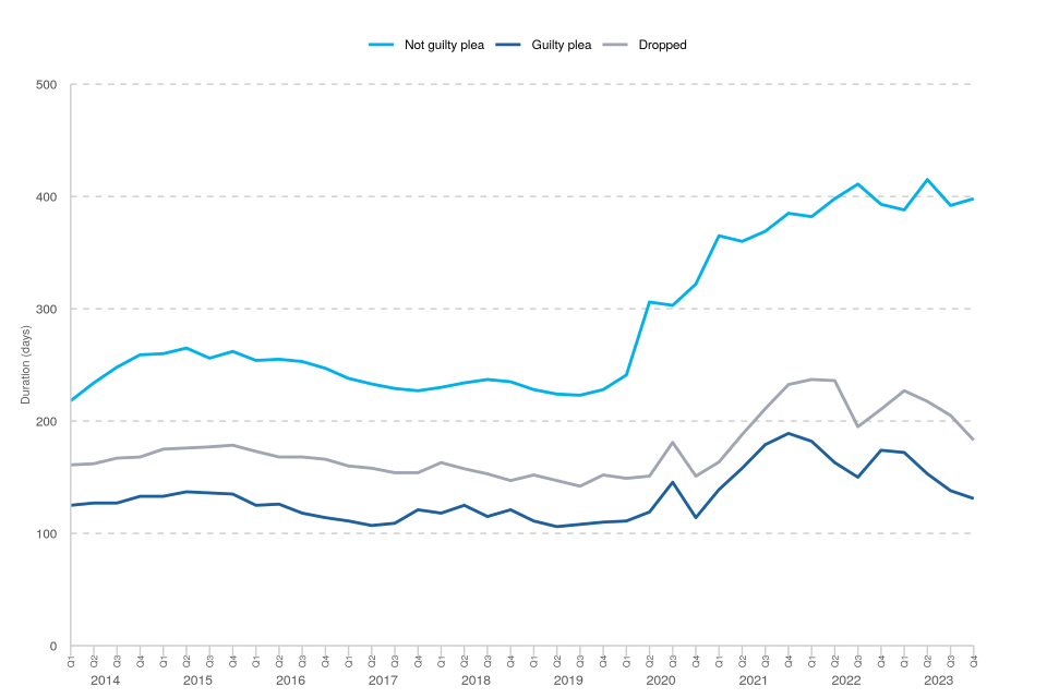 Figure 8: Median duration from receipt to completion in ‘for trial’ cases by plea at the Crown Court, Q1 2014 – Q4 2023 (Source: E2)
