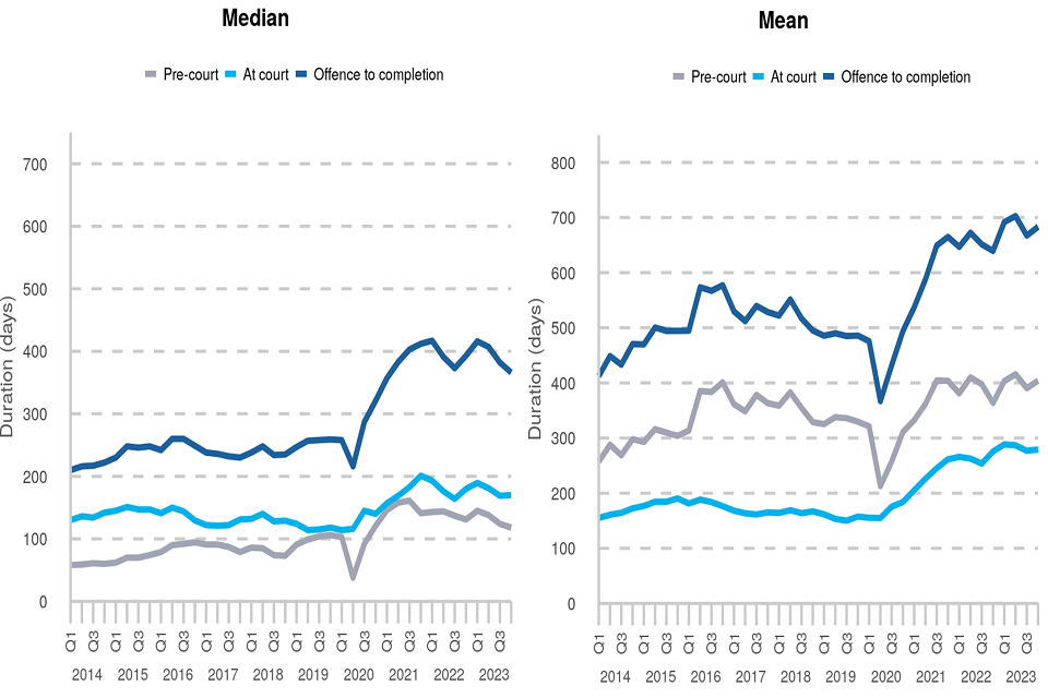‘Pre-court’: the median time from ‘offence to first listing’ decreased by 5% from 124 days in Q3 2023 to 118 days in Q4 2023.