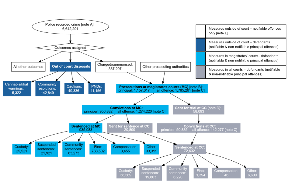 A flowchart describing the flow of individuals through the Criminal Justice System, from police recorded crime to sentencing outcomes.