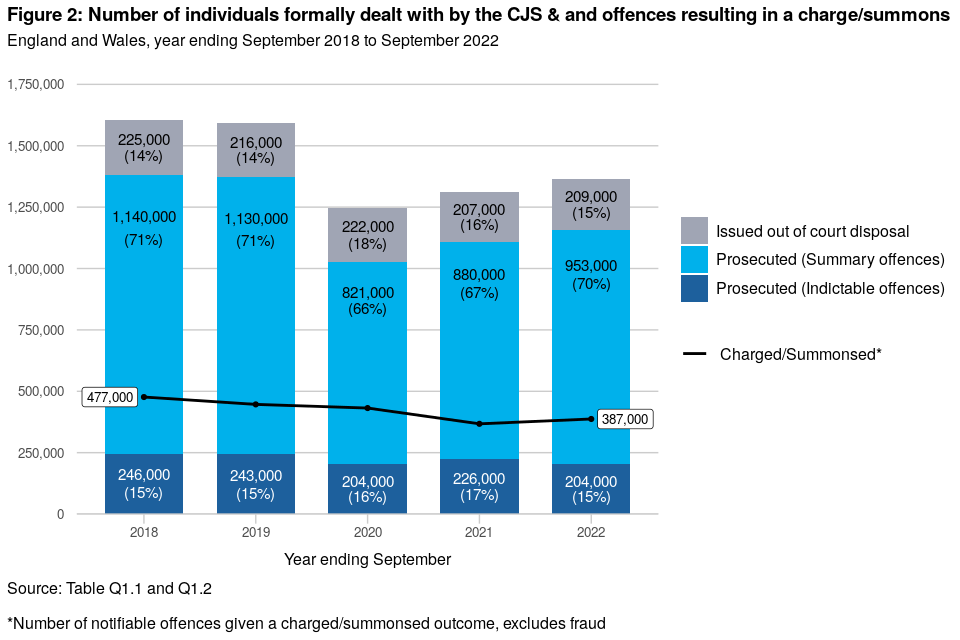 The number of individuals[footnote 1] formally dealt with by the CJS[footnote 2] in England and Wales increased by 4% in the latest year, although this figure is still below pre-COVID levels.