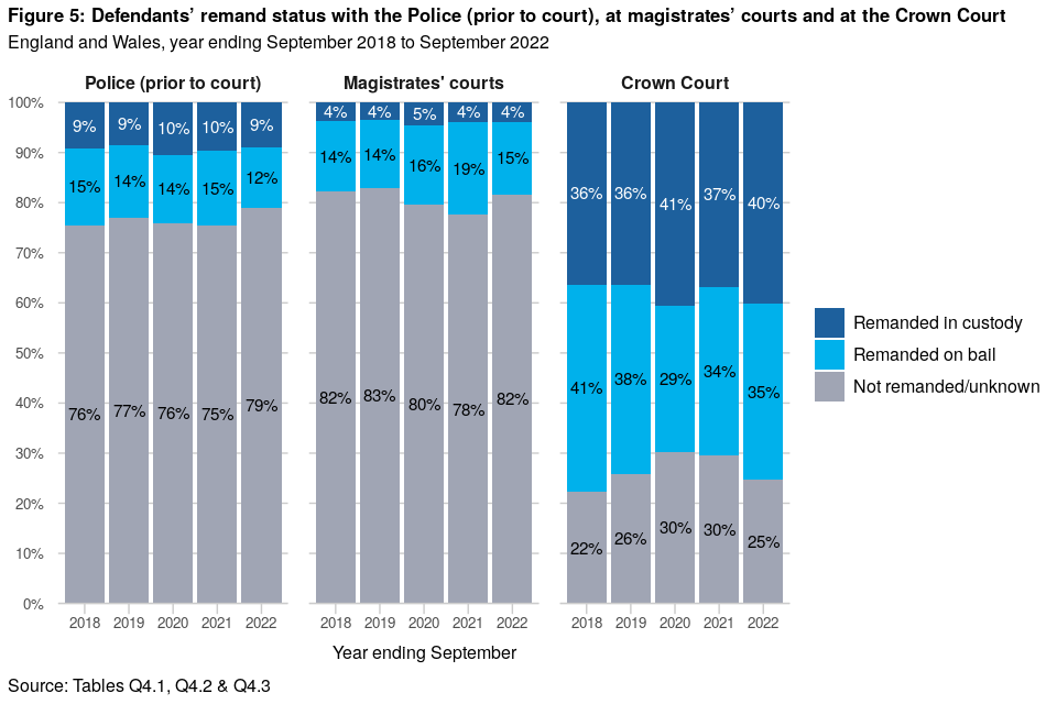 | The proportion of defendants remanded in custody at Crown Court increased | In the latest year, 40% of defendants were remanded in custody at the Crown Court. The volume of defendants remanded in custody at Crown Court increased across all offence types. |