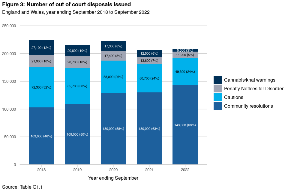 Out of court disposals (OOCDs) are sanctions used by the police to address offences without the need to be dealt with at court. There were 209,000 OOCDs in the year ending September 2022, a 1% increase compared to the previous year. This was driven by an increase of 12,600 community resolutions[footnote 6] which were 10% higher than year ending September 2021, and 31% higher than the levels observed pre-pandemic in the year ending September 2019. This increase was offset, in part, by a collective decrease of over 10,900 across cannabis/khat warnings, penalty notices for disorder (PNDs) and cautions issued, compared to year ending September 2021.