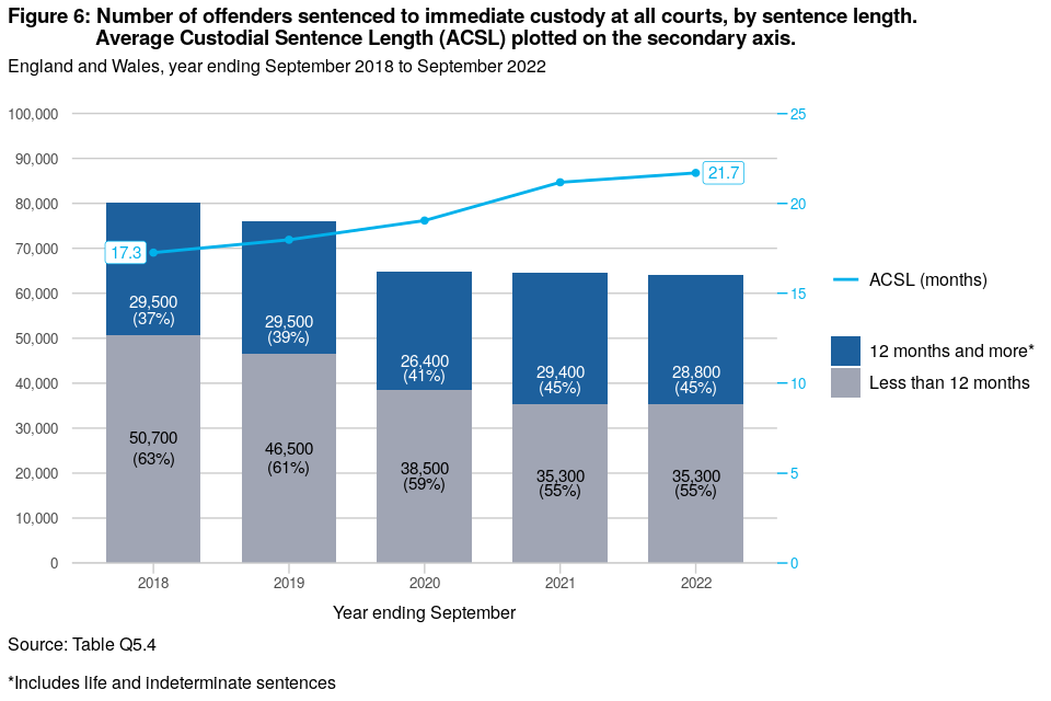 The custody rate for indictable offences has risen to levels seen pre-pandemic at 32% in the latest year, after a fall in the year ending September 2021. The average custodial sentence length (ACSL) for indictable offences has continued to rise from 24.0 months in the year ending September 2021 to 24.8 months in the latest year.