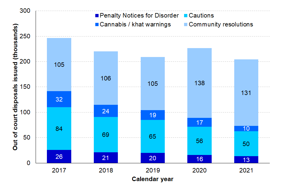 Out of court disposals (OOCDs) are sanctions used by the police to address offences without the need to be dealt with at court. There were 204,000 OOCDs in the year ending December 2021, a 10% decrease compared to the previous year. This was driven by decreases across all types of OOCD. Community resolutions accounted for 64% of all OOCDs in 2021, decreasing 5% in the latest year to 131,000. However, community resolutions remain 25% higher than 2019.