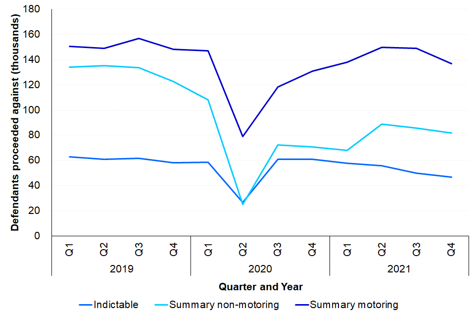 Figure 3: Prosecutions at magistrates’ courts, quarterly by type of offence, England and Wales, January 2019 to December 2021 (Source: Table AH_1 2020 and 2021)