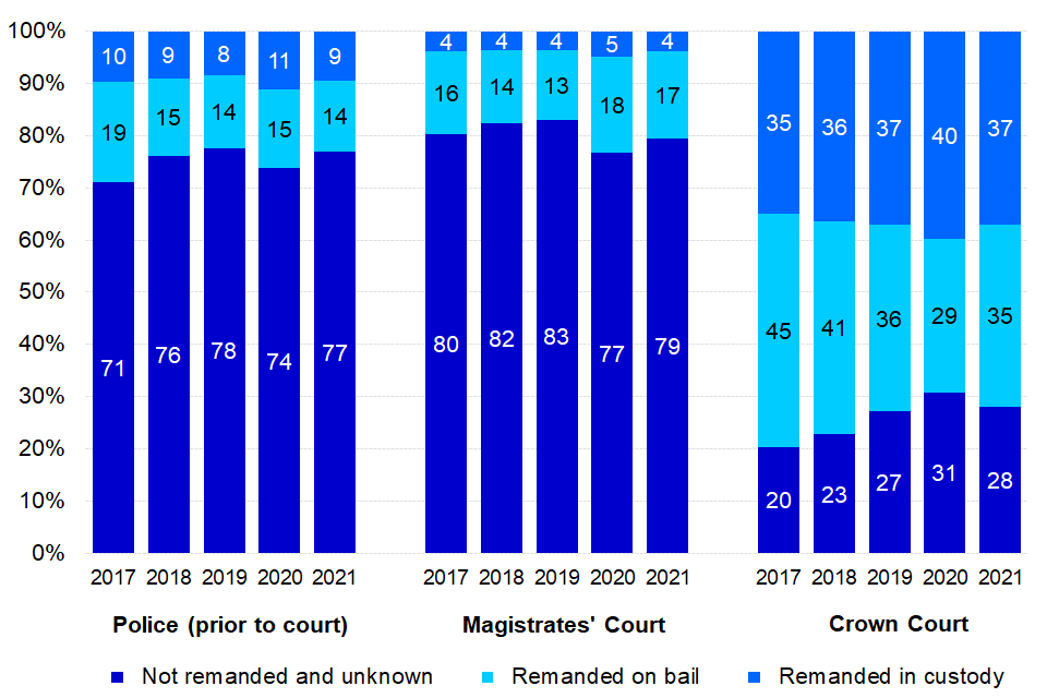 In the latest year, of the defendants remanded in custody at magistrates’ courts, 11% were sentenced to immediate custody, and a further 65% were committed for trial or sentencing at Crown Court. Of those remanded in custody at Crown Court, 74% were sentenced to immediate custody in 2021.