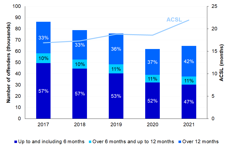 The ACSL for all offences was 21.9 months, an increase of 3.4 months from 2020 and an increase of 7.7 months, or 54%, from 2011. The increase can be partly attributed to the slower recovery of sentences for summary non-motoring offences, reducing the number of shorter custodial sentences. Additionally, there has been a decrease in the proportion of sentences of 6 months or less but an increase in longer sentences (over 12 months) over the past 5 years, resulting in the increase in ACSL (as seen in Figure 5.1).