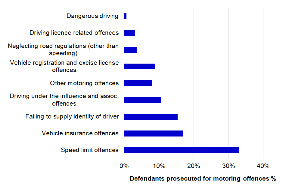 Speed limit offences and vehicle insurance offences remained the most common motoring offences, accounting for 50% of all motoring prosecutions in 2021.