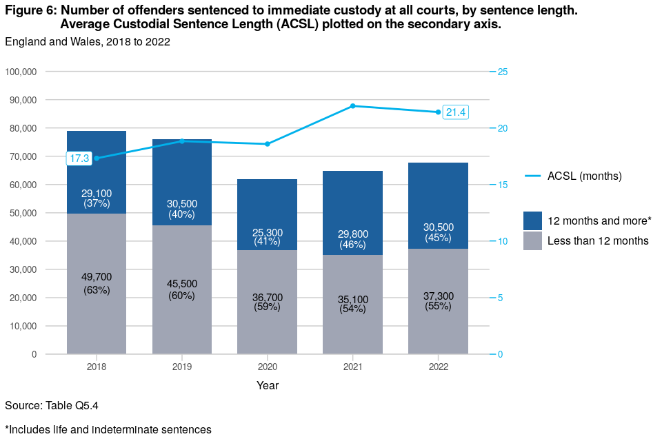 | The average custodial sentence length (ACSL) for indictable offences decreased from 24.9 months in 2021, to 24.3 months in 2022 | ACSL for indictable offences has consistently risen throughout the last 10 years (from 17.0 months in 2012), aside from a 0.3 month decrease in 2020 and in the latest year. |