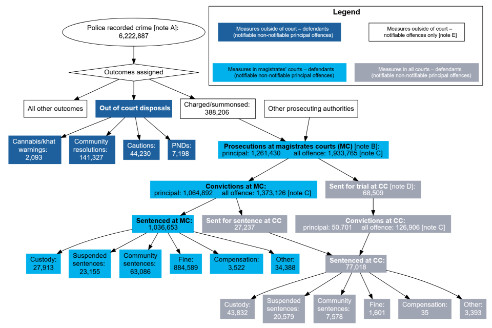 Figure 1: Flow through the Criminal Justice System, 2023, England and Wales[footnote 1]