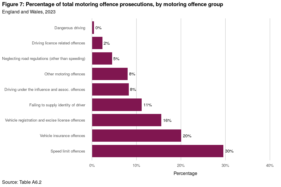 The number of prosecutions for motoring offences increased by 6% from 694,000 in 2022 to 733,000 in 2023, 4% higher than the level seen pre-pandemic in 2019. The increase in motoring offences prosecutions was driven, in part, by an increase in vehicle registration and excise license offences, vehicle insurance offences, and using or causing others to use a handheld mobile phone whilst driving. It is partially offset by reductions in speed limit offences and failing to supply information as to the identity of driver when required. Vehicle insurance offences, vehicle registration and excise licence offences, and speed limit offences[footnote 16] remained the most common motoring offences, collectively accounting for 65% of all motoring prosecutions in 2023 (see Figure 7[footnote 17]).