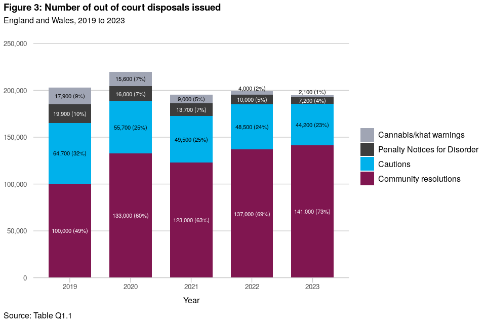 Out of court disposals (OOCDs) are sanctions used by the police to address offences without the need to be dealt with at court. There were 195,000 OOCDs in 2023, which represented an overall decrease of 2% when compared to the previous year. Despite this, there was an increase of 3% in community resolutions[footnote 8], with over 141,000 issued. This represents 73% of the total number of OOCDs. Over the last five years, community resolutions have increased by 41%. There was a collective decrease of 9,000 across all other OOCDs when compared to 2022. Cannabis/khat warnings and penalty notices for disorder (PNDs) decreased by 48% and 28%, respectively, while cautions decreased by 9%.