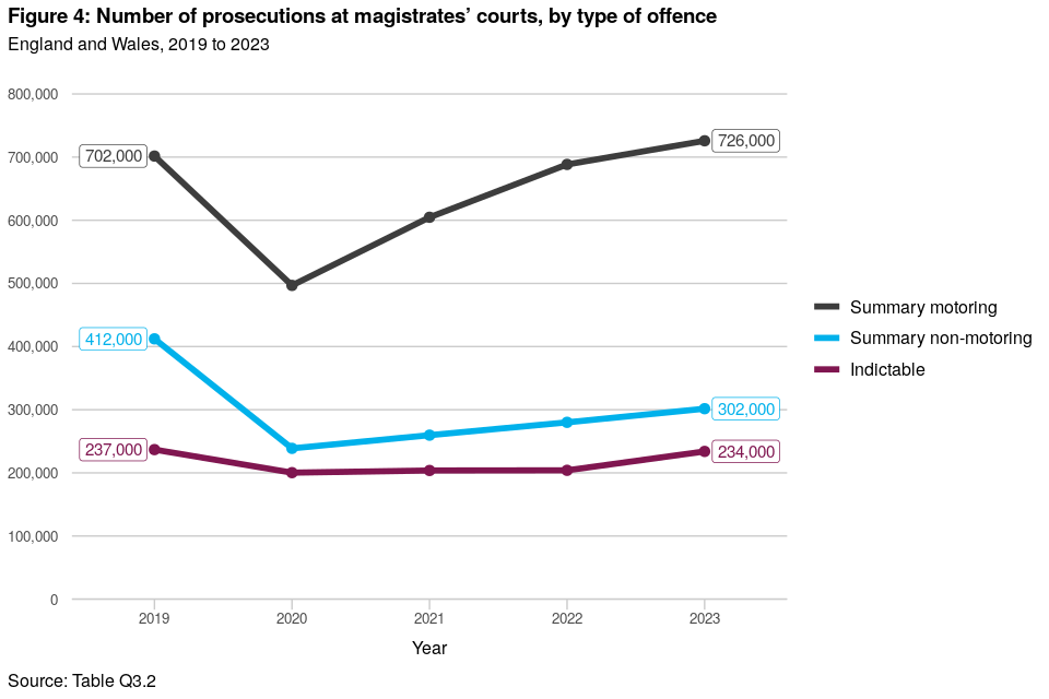 In 2023, there were 1.26 million defendants proceeded against at magistrates’ courts, 8% higher than in the previous year. The increase in the latest year included a 15% increase in prosecutions for indictable offences. Similarly, convictions saw a 7% increase in the latest year, driven by a 12% increase in indictable offences. For summary offences, both prosecutions and convictions increased by 6% when compared to 2022. Despite this, overall prosecutions and convictions remain 7% lower than pre-pandemic levels of 2019.