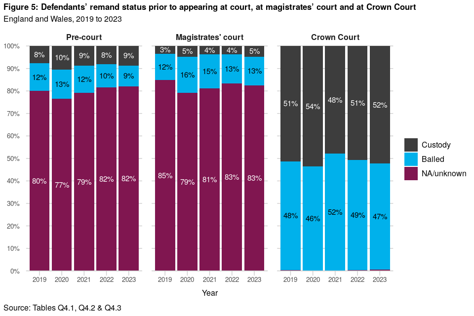 In the latest year, 52% of defendants were remanded in custody at Crown Court, up from 51% in 2022.