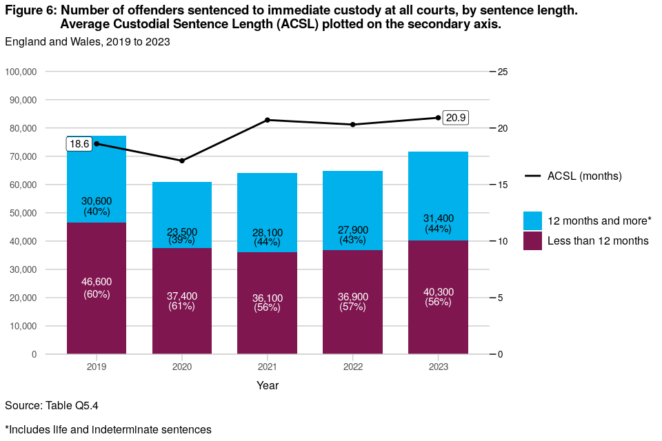 The average custodial sentence length (ACSL) for all indictable offences increased from 23.0 months in 2022 to 23.3 months in 2023