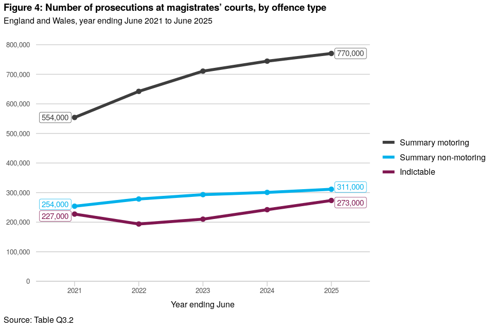 In the year ending June 2025, there were 1.36 million defendants proceeded against at magistrates’ courts, an increase of 5% compared to the previous year. The increase in the latest year included a 13% increase in prosecutions for indictable offences and a 4% increase for summary offences.