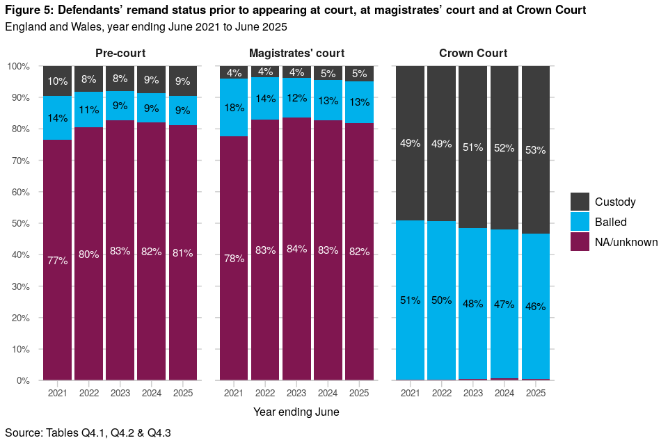 The proportion of defendants remanded in custody increased from 52% in year ending June 2024 to 53% in year ending June 2025, while bail has continued to decrease to 46%.