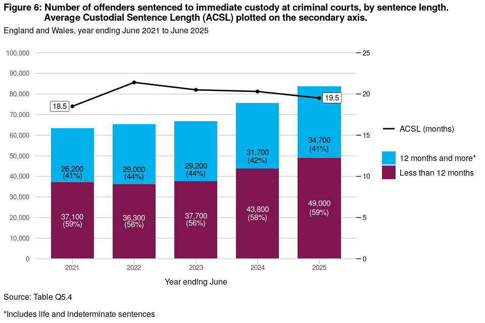 The number of offenders sentenced to immediate custody increased by 11% from the previous year, up to 83,700, the highest level it has been since year ending June 2019 (86,600). The number of offenders receiving a custodial sentence of less than 12 months increased by 12% - accounting for 59% of all custodial sentences. While those receiving a sentence of 12 months or more increased by 9%, accounting for 41% of all custodial sentences.