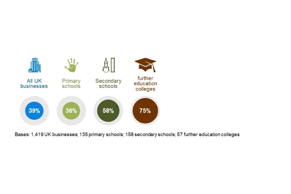 - Around a fifth of primary schools (19%) and a quarter of secondary schools (24%) say they have reviewed such risks posed by their immediate suppliers or partners, versus four in ten further education colleges (40%). This compares to 12 per cent of businesses.