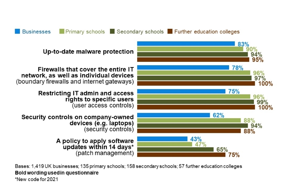 - This year, for the first time, we also asked about awareness of National Cyber Security Centre guidance on home working and video conferencing services, which was first published in 2020 in response to the COVID-19 pandemic and ensuing UK lockdown. All three education institutions show more awareness of this guidance than the typical business (21% of which are aware), but it is still much lower for primary schools (43%) than for secondary schools (63%) and colleges (74%).