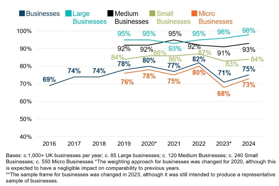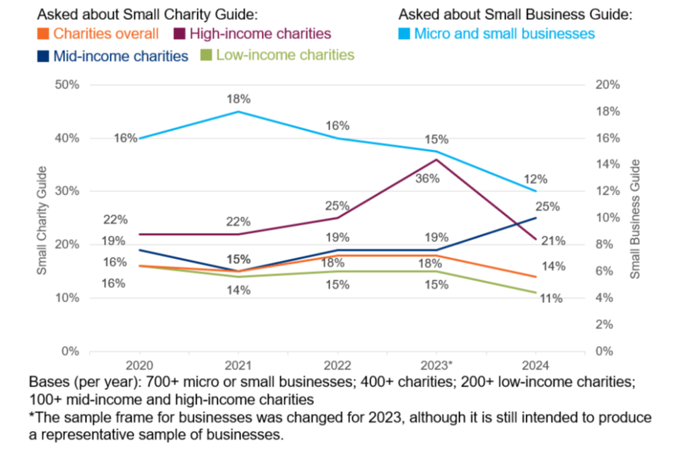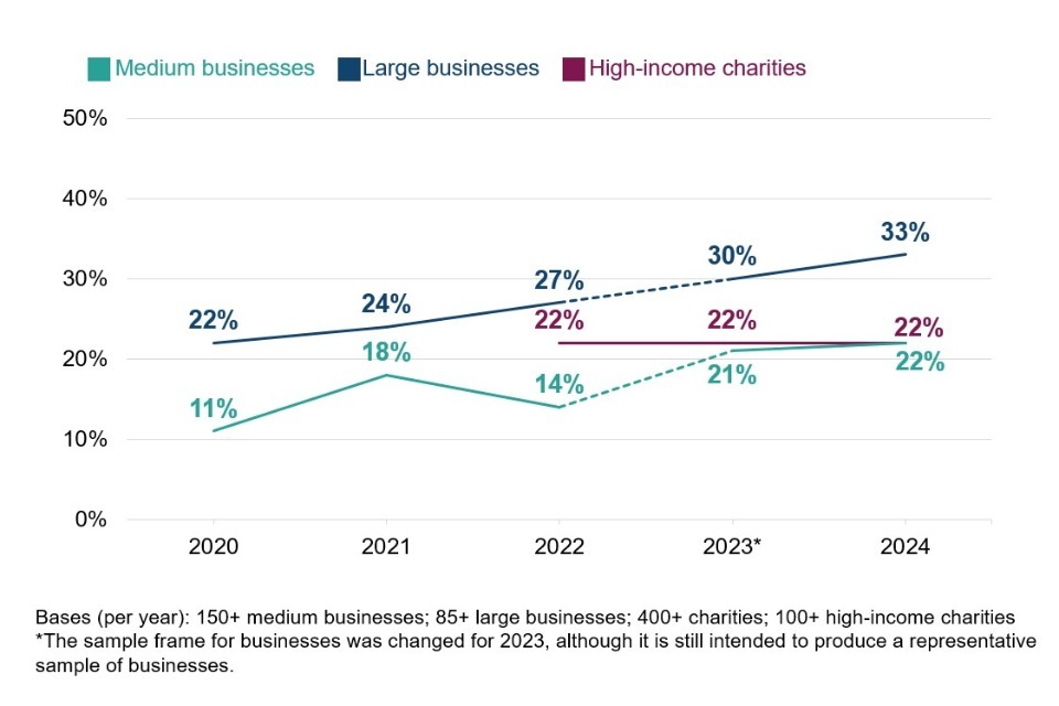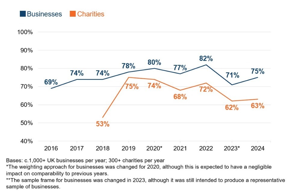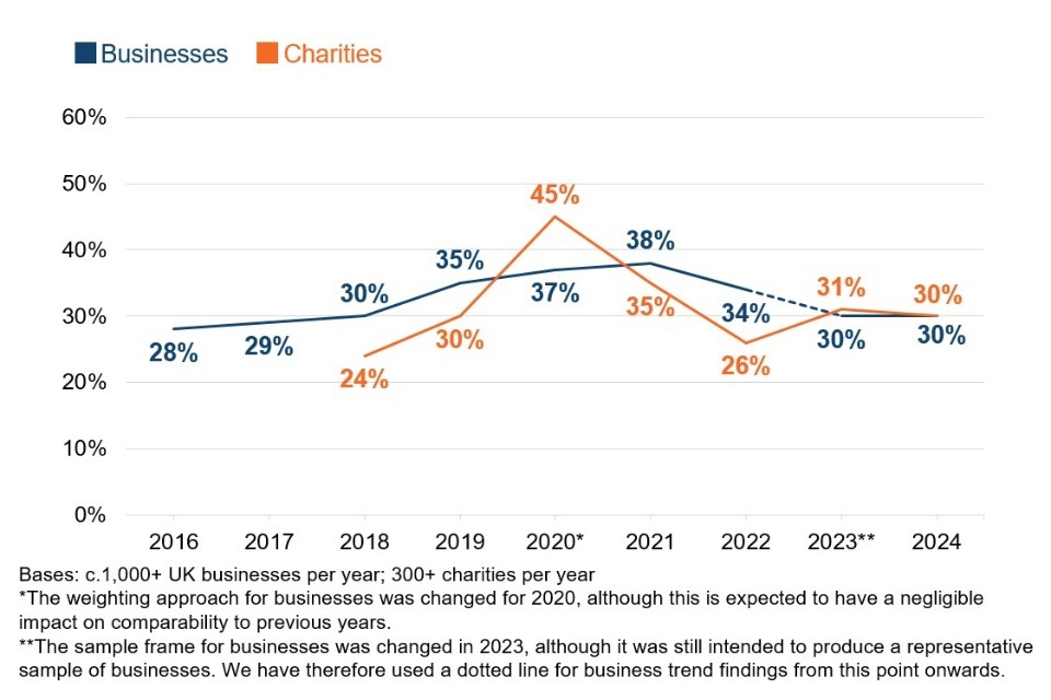 In calculating these margins of error, the design effect of the weighting has been taken into account. This lowers the effective base size used in the statistical significance testing. The overall effective base size was 1,398 for businesses (vs. 1,702 in 2023 and 816 in 2022) and 652 for charities (vs. 808 in 2023 and 267 in 2022). ↩