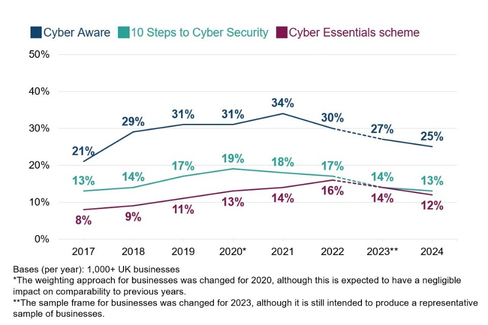 The proportion of businesses seeking external information or guidance on cyber security has fallen since 2023. In addition, a sizeable proportion of organisations, including larger organisations, continue to be unaware of government guidance such as the 10 Steps to Cyber Security, and the government-endorsed Cyber Essentials standard. Linked to this, relatively few organisations at present are adhering to recognised standards or accreditations.