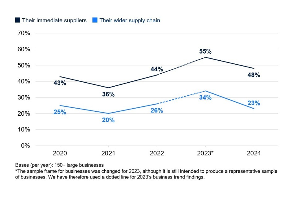 Just over one in ten businesses say they review the risks posed by their immediate suppliers (11%, vs. 9% of charities). More medium businesses (28%) and large businesses (48%) review immediate supplier risks.