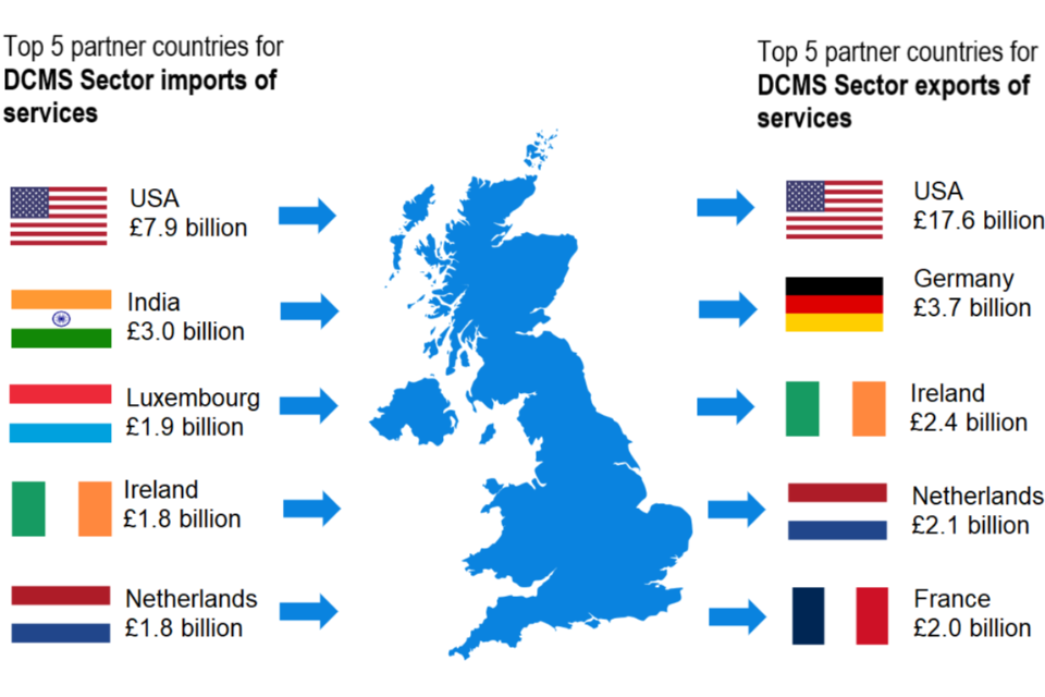 To all the top five countries, businesses in the creative industries were the largest exporters of services in DCMS sectors.