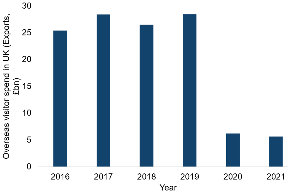In 2021, the value of exports in the tourism sector – the spending on both goods and services by overseas visitors to the UK – was £5.6bn.