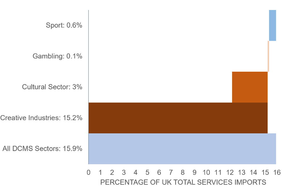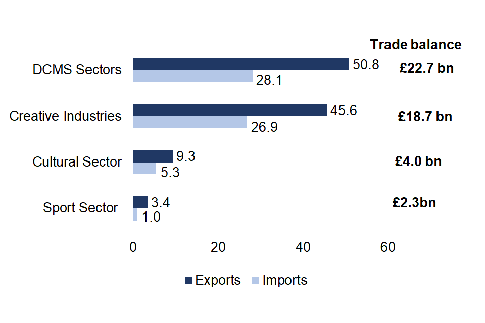 These figures represent trade in goods and services combined and therefore are not directly comparable with the trade in services or trade in goods estimates presented for all other sectors. Therefore, estimates of imports and exports of tourism are not presented in the DCMS sector totals.