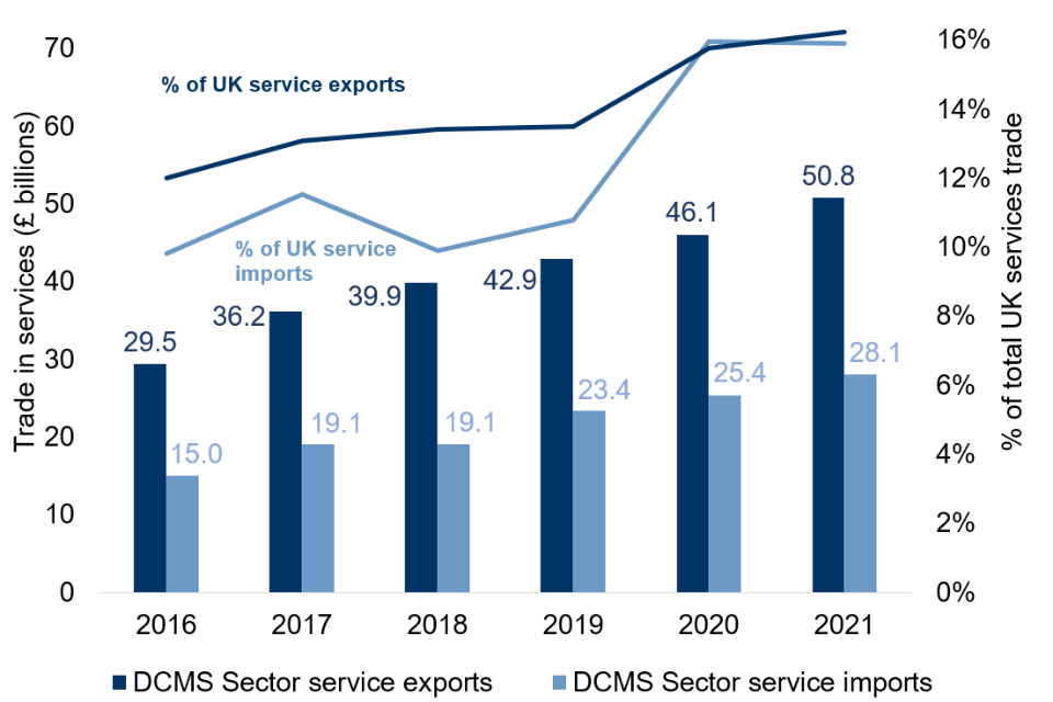 - estimates of exports and imports of services by businesses in DCMS sectors