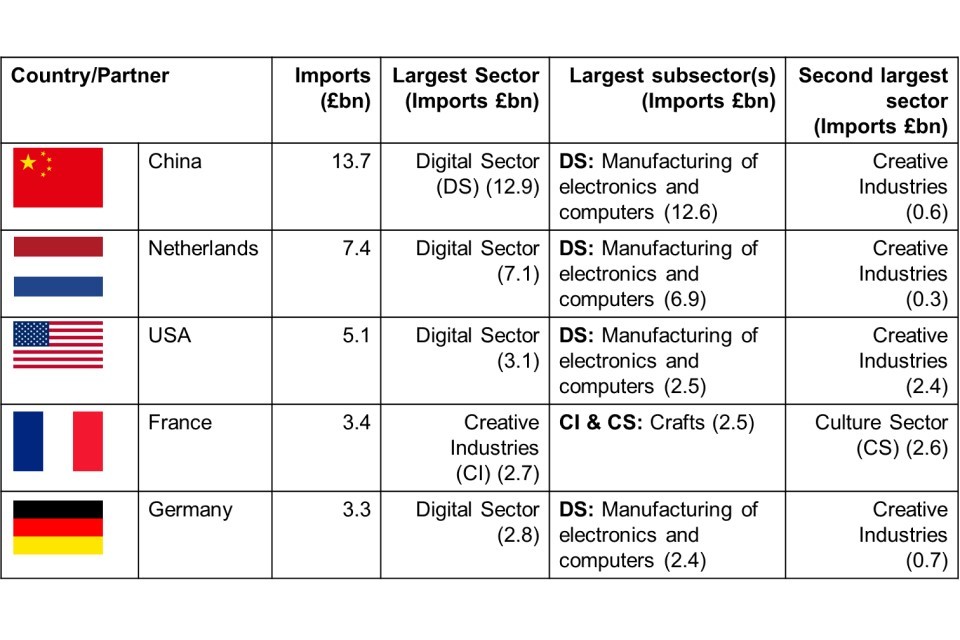 - £13.7 billion of DCMS Sector goods were imported from (mainland) China in 2019, (25.6% of all DCMS Sector goods imports), £7.4bn (13.8%) from the Netherlands, £5.1bn from the USA (9.5%) in 2019