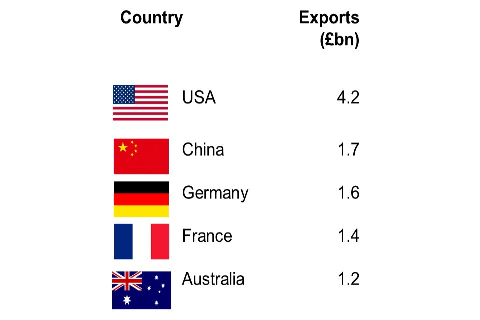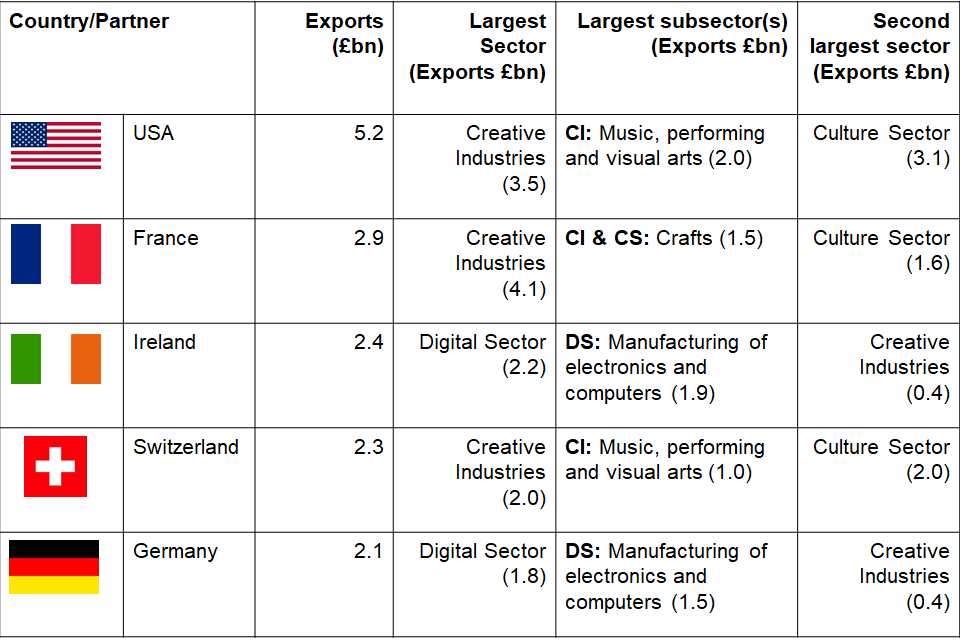 - £5.2bn of DCMS Sector goods were exported to the USA (17.4% of total DCMS Sector goods trade exported, by value), £2.9bn of goods were exported to France (9.7% of the DCMS Sector total), and £2.4bn of goods were exported to Ireland (7.9% of the DCMS sector total).