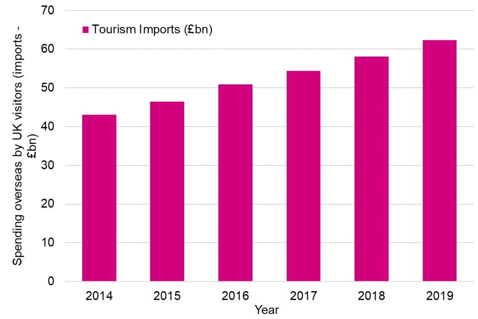 - Exports and imports of tourism (exports defined as spending on goods and services by overseas visitors to the UK; and imports defined as spending by UK visitors overseas; again, up to and including 2019)